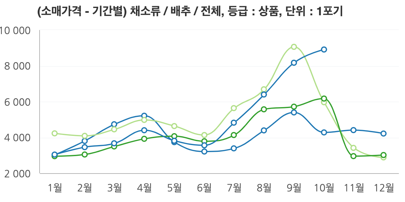 그래프를 통해 2015년부터 2024년까지의 배추 가격 변동을 살펴보면, 2024년 10월에는 9,073원으로 급등한 후, 11월에는 다시 하락할 것으로 예상되고 있어 김장철이 시작되기 전인 11월 초에 구매하는 것이 좋습니다. 그러나 가격이 상승할 가능성이 있으니 미리 계획하고 예약하는 것이 바람직합니다.