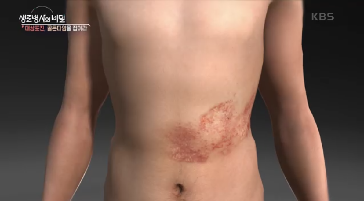 - 피부 발진과 수포 (몸 한쪽에 주로 발생)