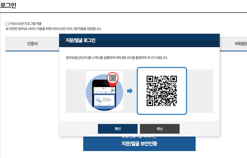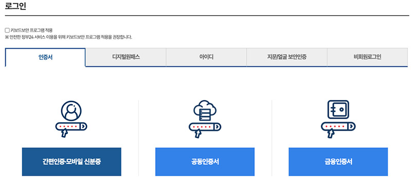 - 공동・금융 인증서 또는 지문・얼굴 보안인증 + 휴대폰 본인인증