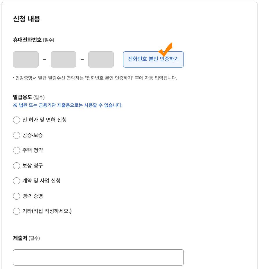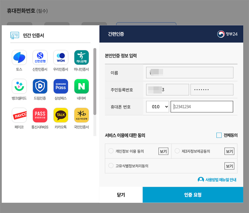 - 간편(민간) 인증으로 로그인하지 않은 경우, 휴대폰 번호 인증 필요