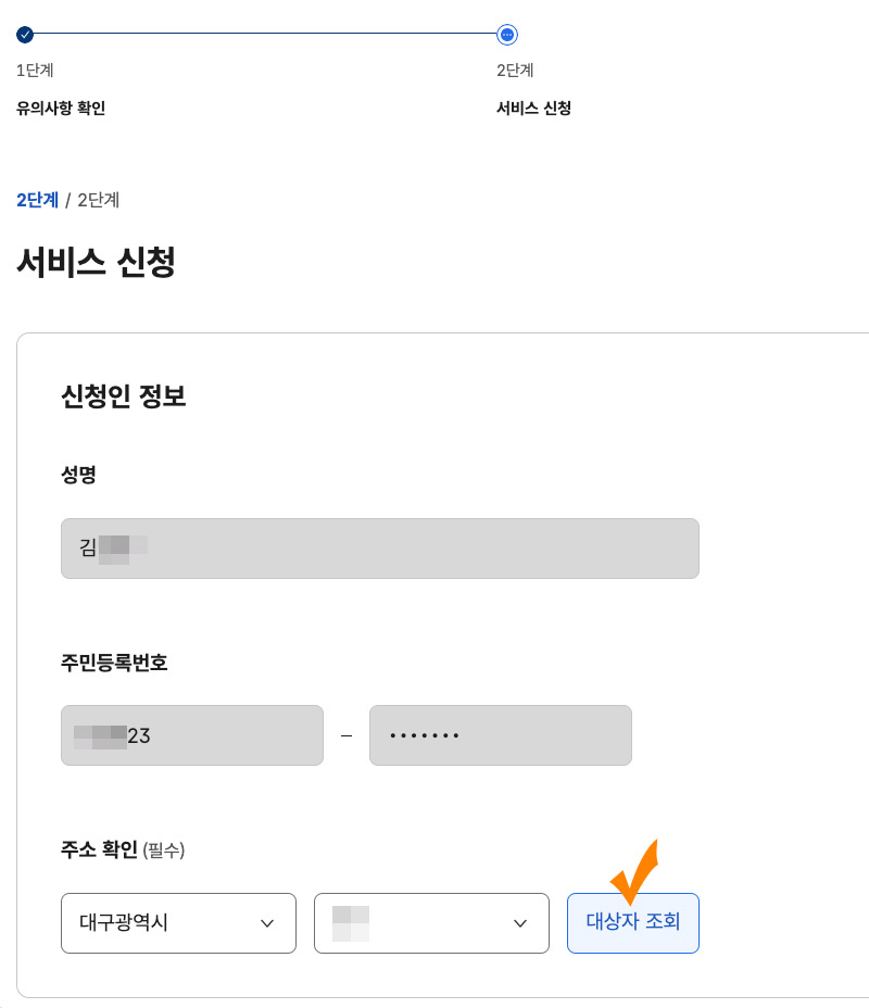 - 유의사항, 이름, 주민등록번호 확인 및 주소 선택 후 '대상자 조회' 클릭
