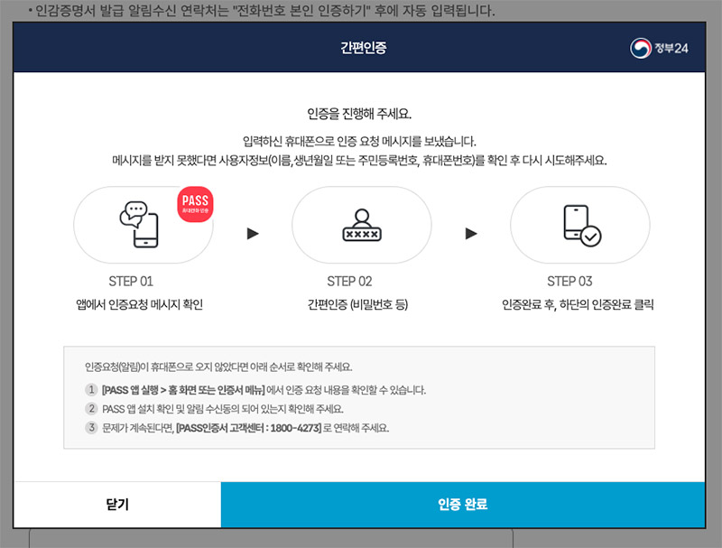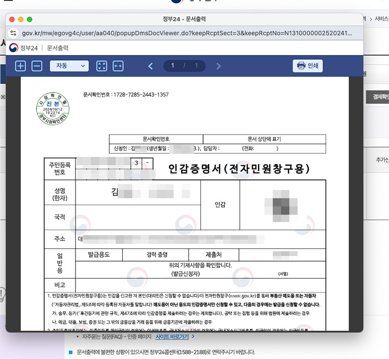 • 본인 확인을 위해 사용되는 인감증명서는 개인정보 보호 및 도용방지와 보안을 위해 2번의 본인인증을 거칩니다.