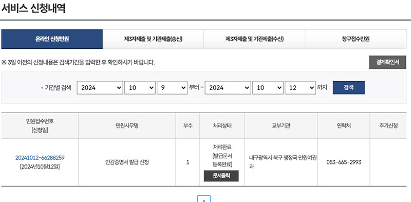 - 신청 내역 확인 후 '문서출력' 클릭하여 증명서 출력