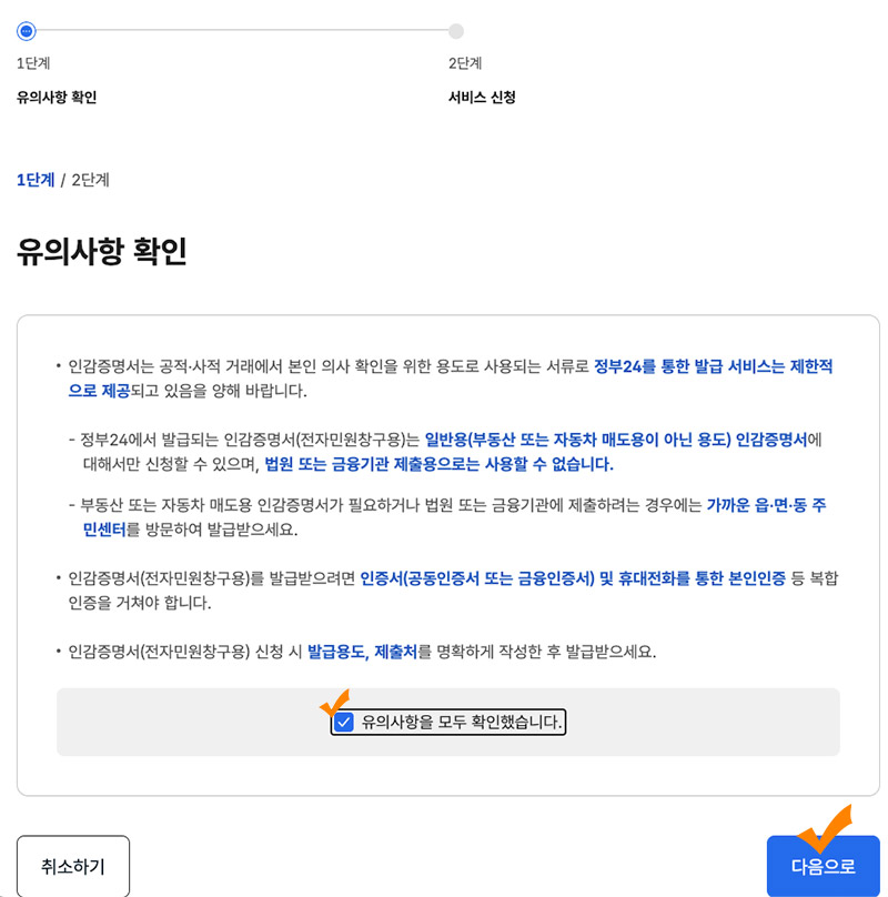 2. 일반용 인감증명서만 신청할 수 있습니다. 부동산 및 자동차 매도용, 법원이나 금융기관 제출용으로는 사용할 수 없습니다.