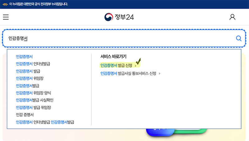'인감증명서'를 검색 > 인감증명서 발급 신청 선택