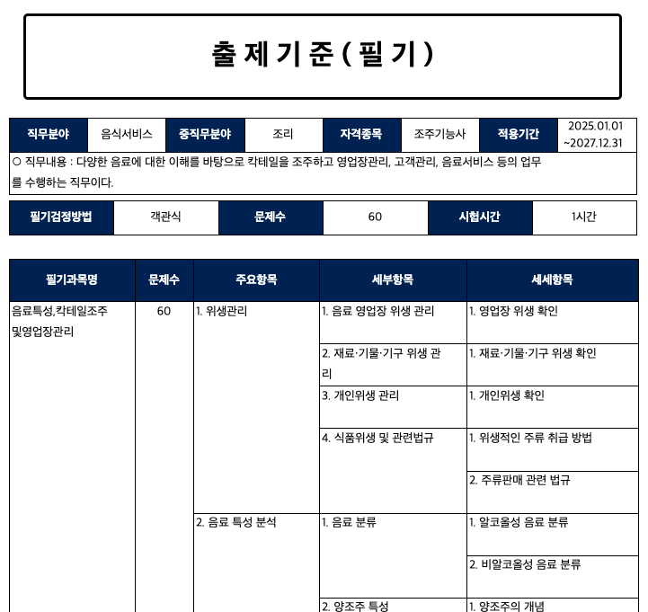 - 칵테일의 종류, 주재료와 보조재료의 조화, 조주 기구 사용법 등 실무 중심의 지식을 평가합니다.
